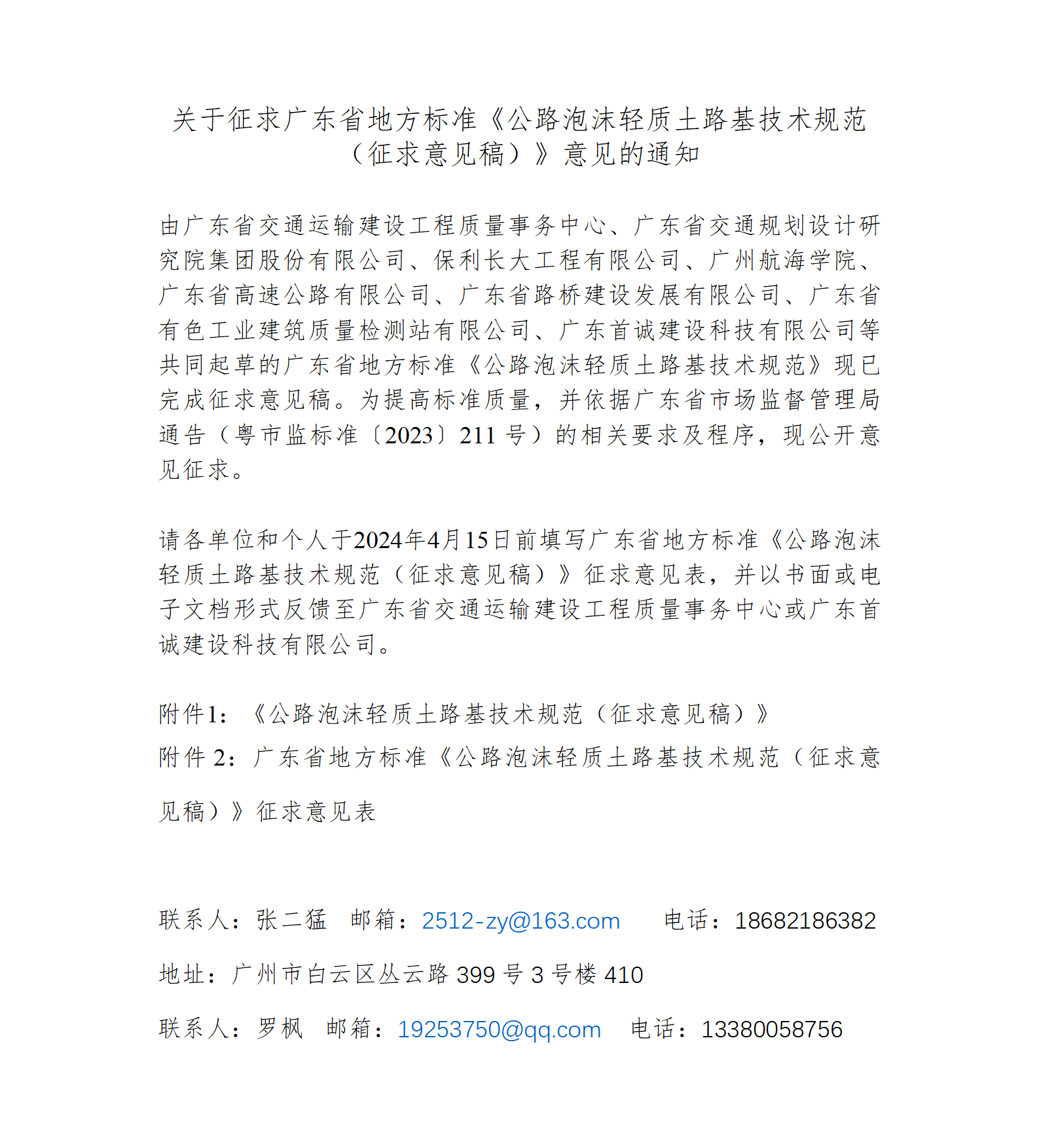 關于征求廣東省地方標準《公路泡沫輕質土路基技術規范(征求意見稿)》意見的通知